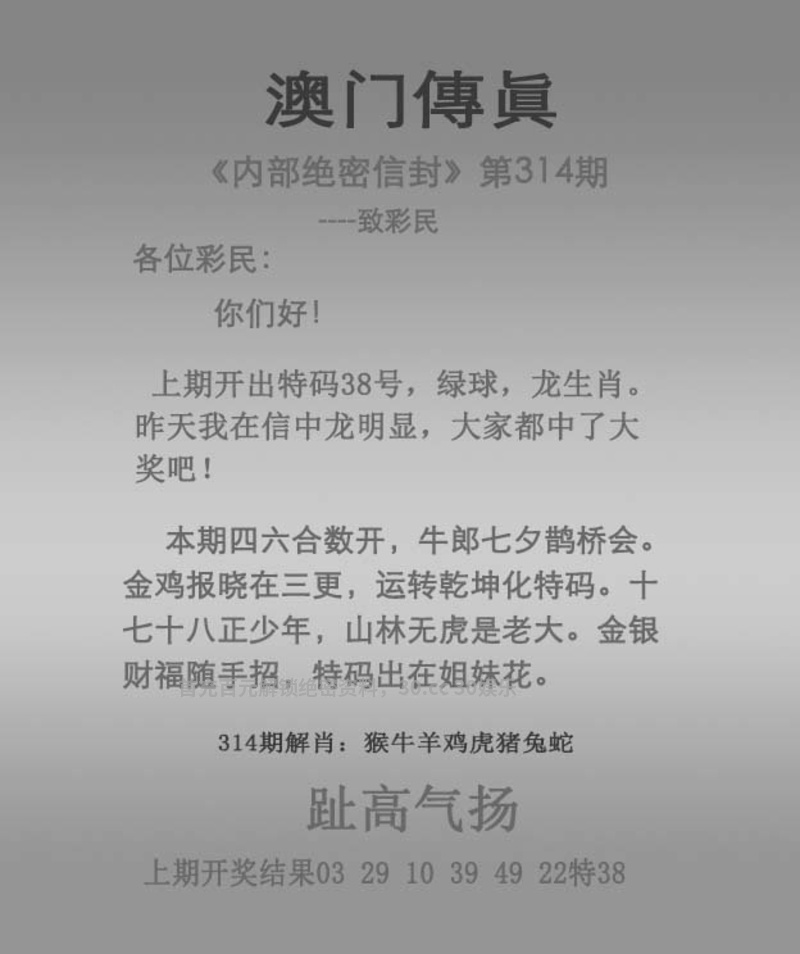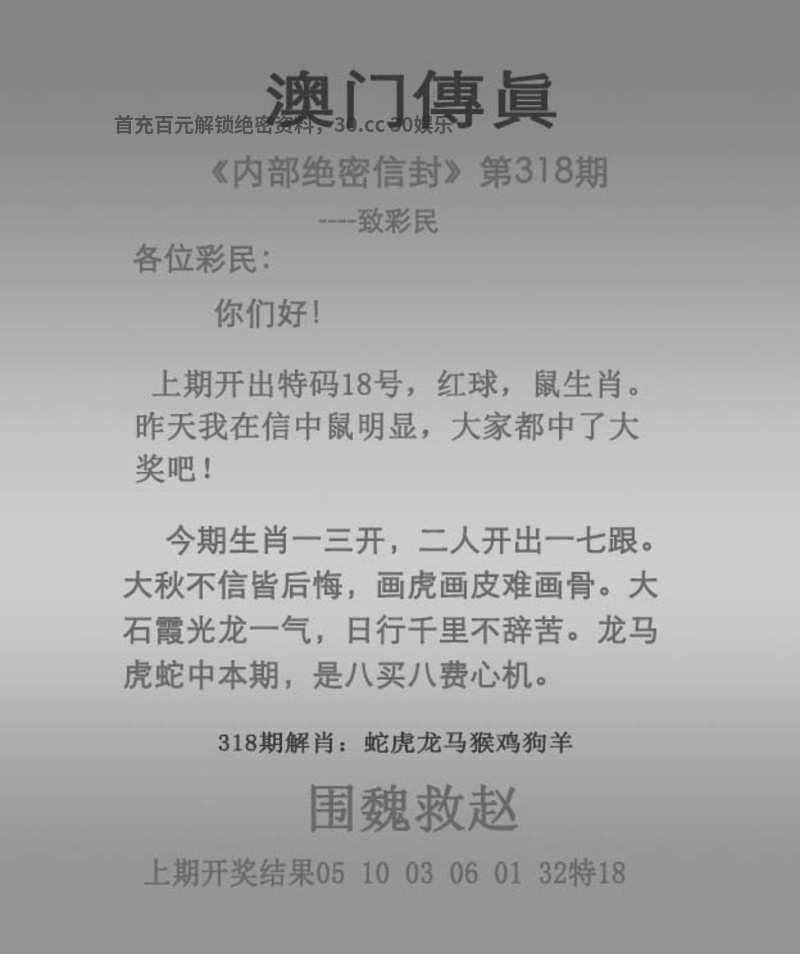 317期【马会传真】开鼠18准 今期生肖一九开,狗打老鼠无功劳 腊月冬季宰大猪,特定红绿满园春 六合中间问缘分,时来运转码中游 虎头蛇尾难成事,本期玄机诗中寻 解:今期腊月冬季宰大猪,解家禽生肖牛猪鸡羊狗马,特定红绿满园春,解红波 综合:鸡猴羊鼠狗牛兔龙虎 主特:09.34.35.18.32.05.39.38.40 |